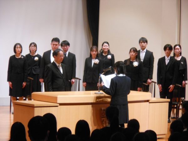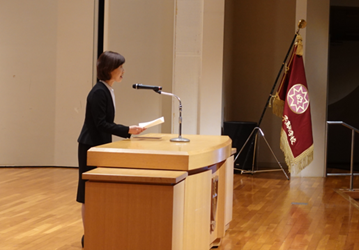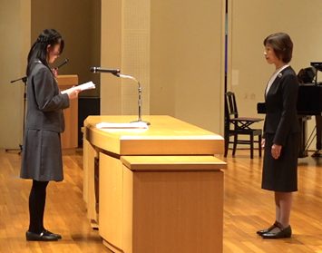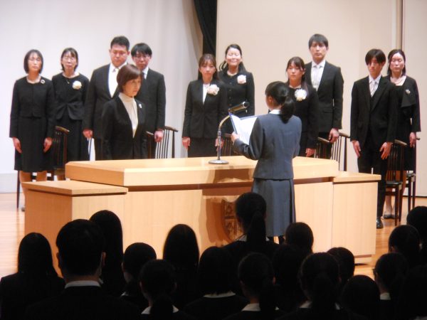 そして、私たち一人ひとりが校訓『正・浄・和』に基づき、『ほんとうの私』を目指して、助け合いながら豊かな学校生活を送ることを誓います」。(高等学校新入生代表)