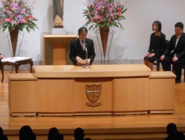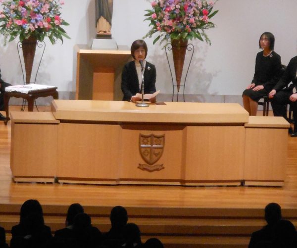 「本校の校訓『正、浄、和』を大切にしていくこと、すなわち、『ほんとうの私を生きる』のだという希望を持って、毎日の学校生活を送ることを私たちは大いに望んでいます。ほかの誰にも代わりができないあなたの存在、あなた固有の使命を与えられているご自分の人生、あなたがこの上なく大切な存在であること、これらを今ここで、もう一度心に深く刻んで、中学校生活、高校生活をスタートいたしましょう。(中略)