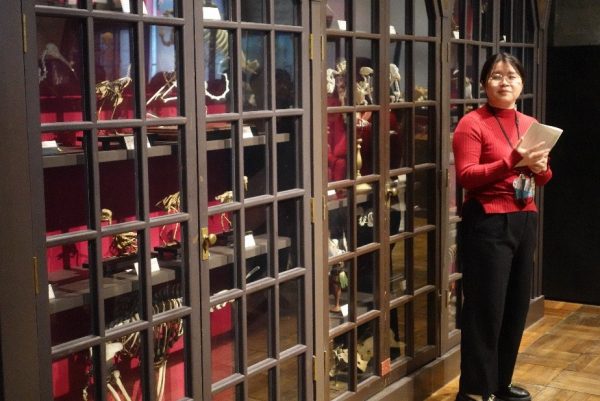 さまざまな動物の骨格標本が並べられたショーケース。インターメディエイトが、その中の1つを指しながら何の骨格標本であるかを尋ねます。生徒たちからはすぐに「鳥!」という答えが。